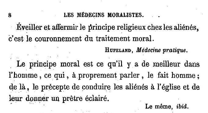 Le fou ce n’est plus tant celui qui ne voit pas la réalité parce qu’atteint d’une maladie du raisonnement, mais celui qui ne sait pas se contrôler, résister au mal. Il n’est donc plus question à cette époque de diagnostiquer et de proposer un traitement en fonction d’une analyse clinique, mais d’enfermer et exercer un rapport de force suffisant pour ramener le fou à un comportement considéré normal, c’est-à-dire qui respecte les valeurs morales et les obligations institutionnelles. C’est l’avènement du traitement moral.2